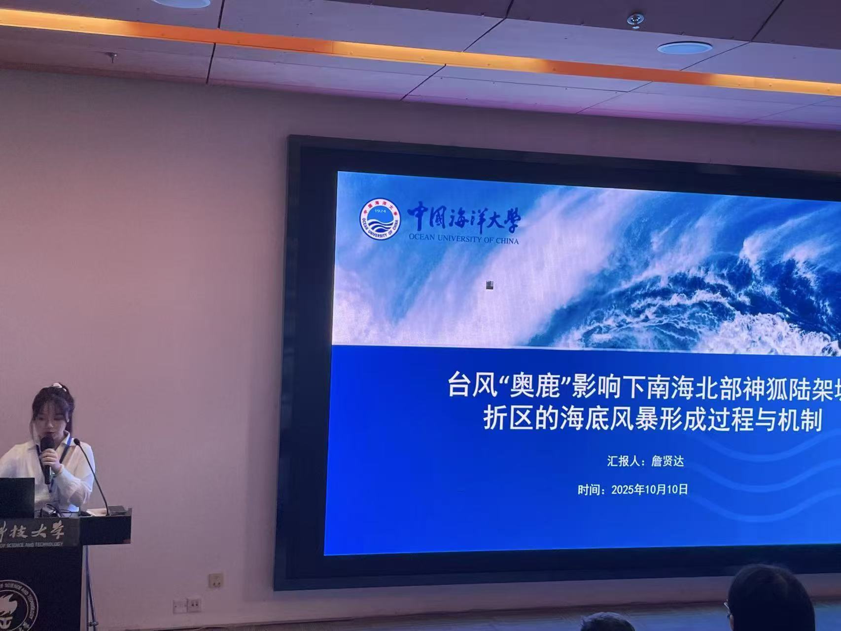 2025年10月10日, 硕士生詹贤达在第十二届南海年会作演讲报告《台风“奥鹿”影响下南海北部神狐陆架坡折区的海底风暴形成过程与机制》。